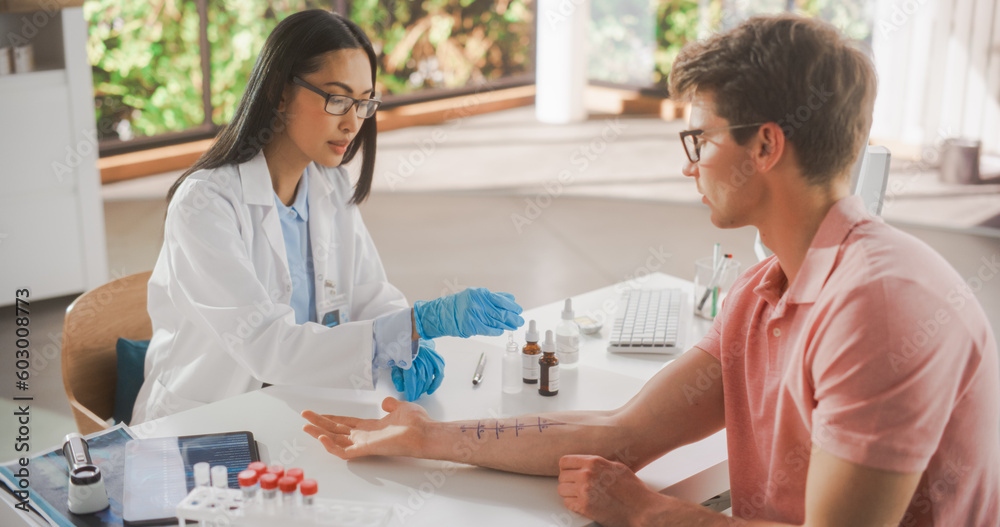 Young Asian Allergist is Conducting a Prick Scratch Test to Diagnose Any Allergic Reaction on a Young Male's Forearm During a Health Check Visit to a Medical Clinic. Female Doctor Working in Hospital