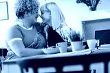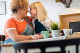 Happy female couple sitting at a table, enjoying a salad meal together.