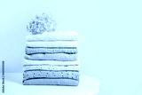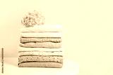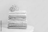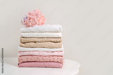 Stack of baby clothes with flowers. Cotton clothes and muslin swaddle blanket in pastel colors. Clean freshly laundered, neatly folded kids clothes.