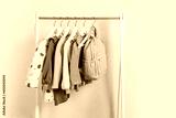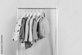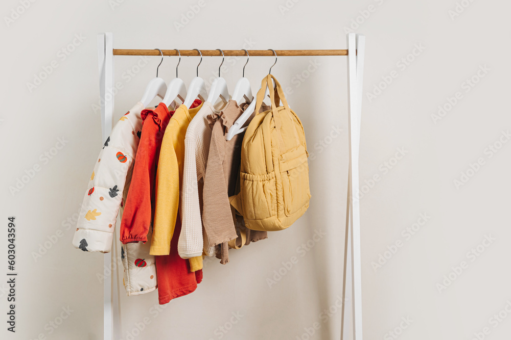 Clothing Rack with children's outfits close up. Fashion clothes in autumn colors on hangers in wardrobe. Kids wardrobe. Set of kids clothes and accessories.