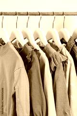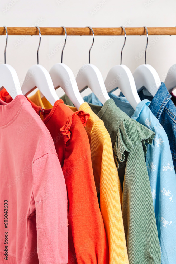 Clothing Rack with children's outfits close up. Fashion clothes in rainbow colors on hangers in wardrobe. Kids wardrobe. Set of kids clothes and accessories.