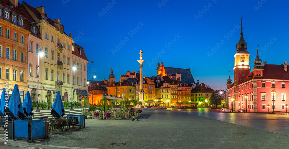 Panoramic view of Castle Square with Royal Castle in Old town at night, Warsaw, Poland.