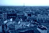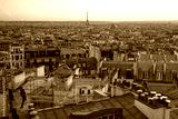 Aerial panoramic view from Montmartre over Paris roofs at nice pink sunrise, Paris, France