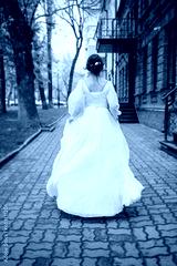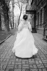 without a face. Rear view of a dark-haired woman in a wedding dress.