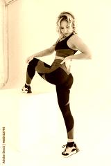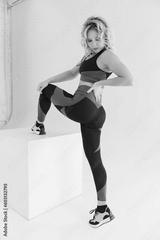 a blonde in a tracksuit makes stretching lunges on a white cube