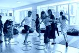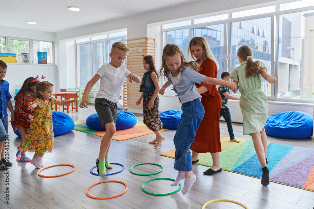 Small nursery school children with female teacher on floor indoors in classroom, doing exercise. Jumping over hula hoop circles track on the floor.