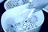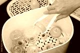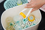 hand of mother feeding baby milk bottle into Steam sterilizer