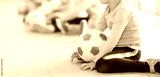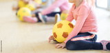 Children in kindergarten at soccer class. Little girl with foam soccer football balls sitting in line and playing game. Sports soccer training at kindergarten