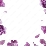 Overlay of flying purple flowers and petals, floral frame. Isolated