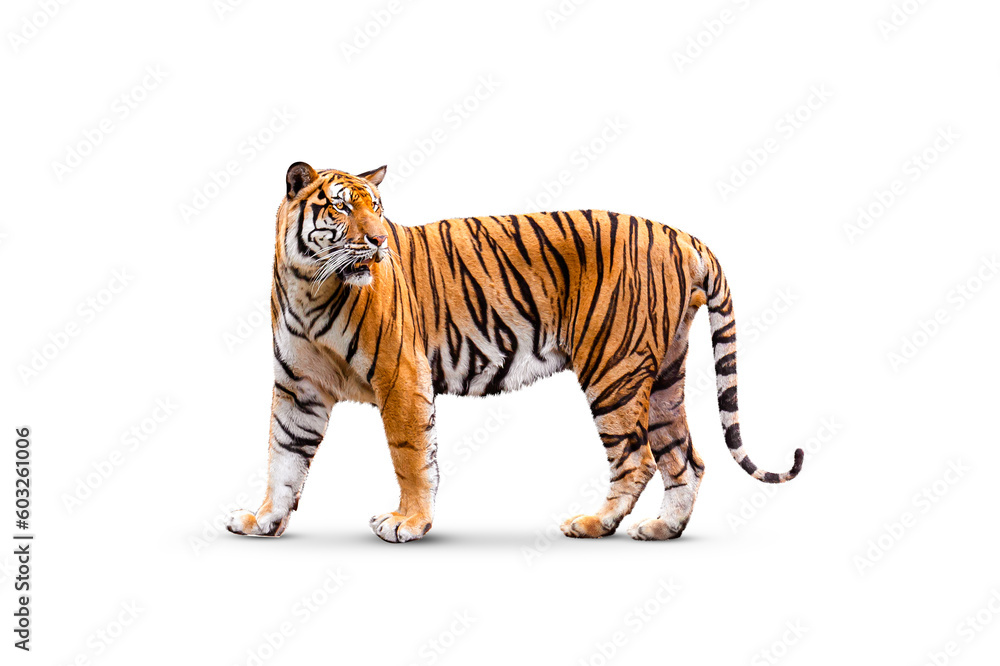royal tiger (P. t. corbetti) isolated on white background clipping path included. The tiger is staring at its prey. Hunter concept.