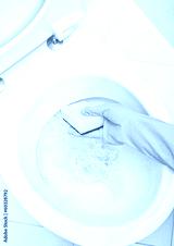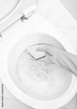 Hands on yellow gloves cleaning a WC