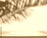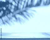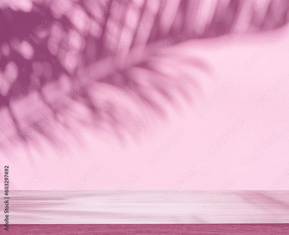 Blurred shadow of tropical palm leaves on pink wall and table top in the foreground. Summer concept.