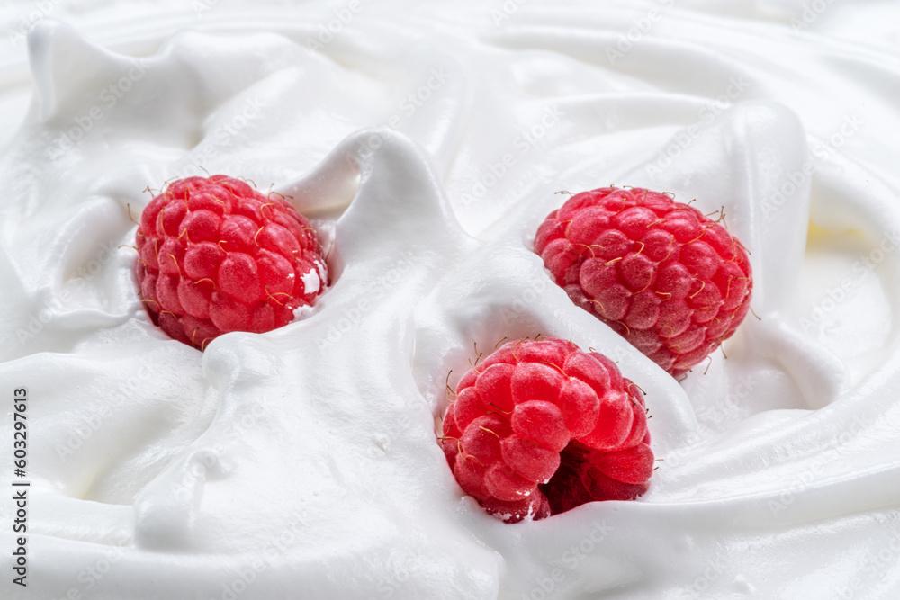 Fresh raspberries in the yoghurt or cream. Top view.