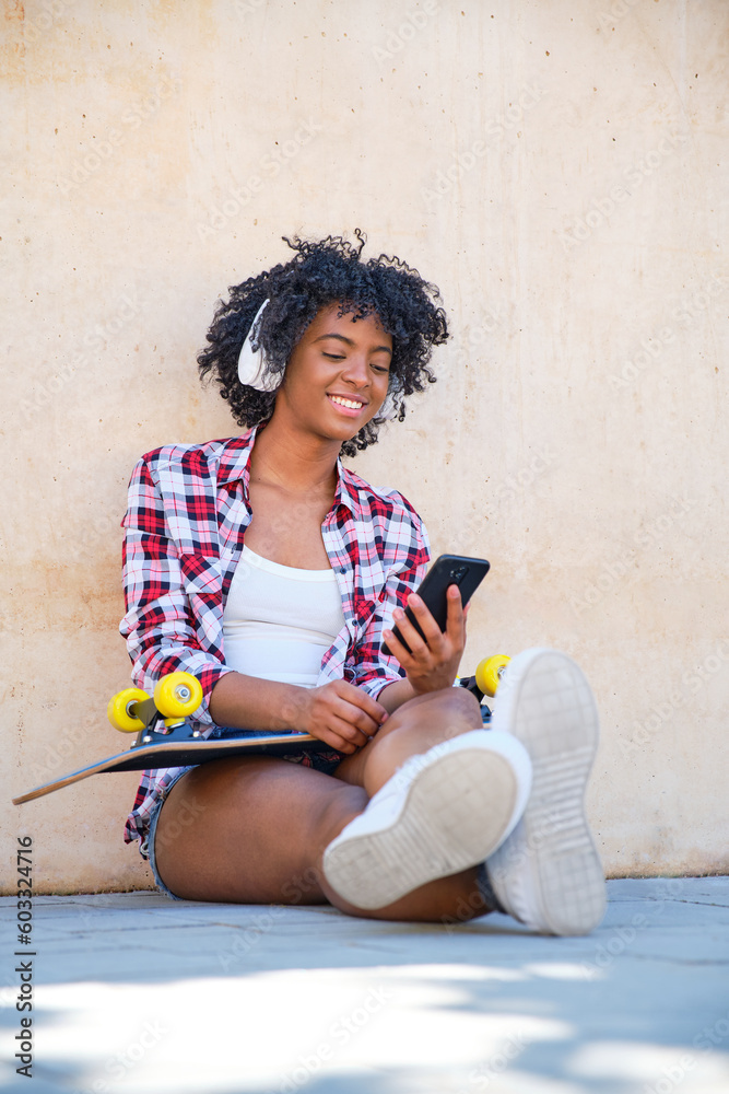 young afro girl smiling listening to music on her smartphone with her skateboard resting on her legs