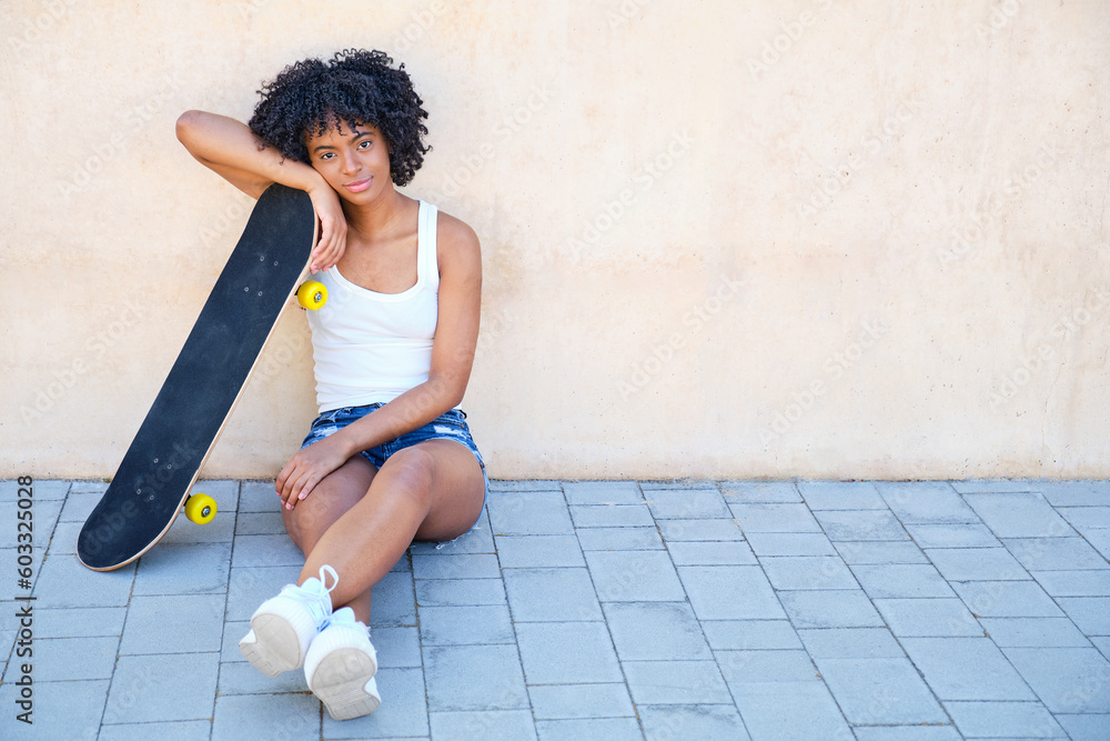 young afro girl sitting on the floor with her arm and head resting on her skateboard