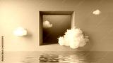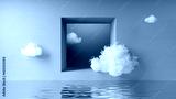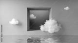 3d render, abstract fantasy surreal background with square window in the blue wall and white clouds flying above the water. Fantasy geometric wallpaper. Dreaming metaphor