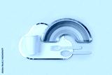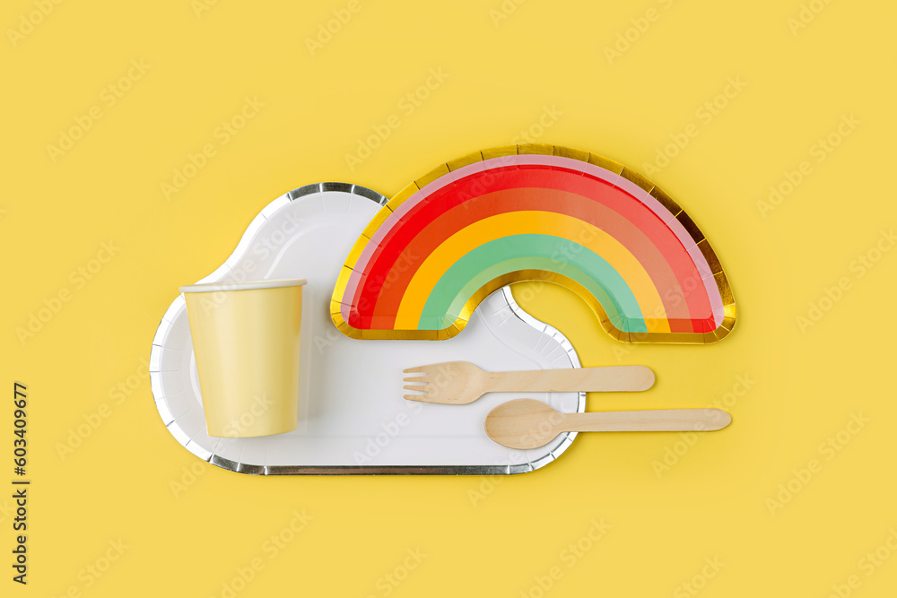 Cute paper party plates in the shape of rainbow and clouds with cups for themed kids party. Birthday party decorations on yellow background. Set of holiday disposable tableware for party or picnic.