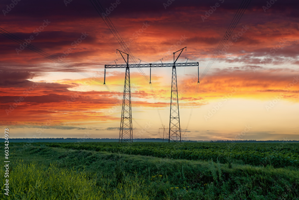 Overhead power line on a transmission tower in the field of young sunflower at colorful sunset in Ukraine.