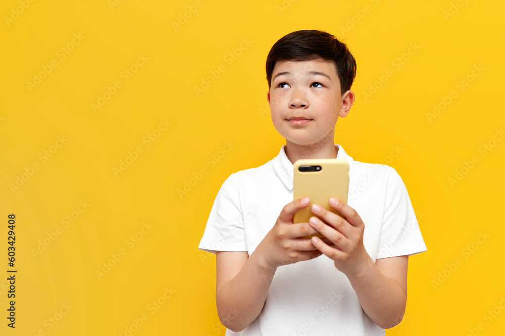 pensive little asian boy using smartphone and daydreaming over yellow background, korean child holding mobile