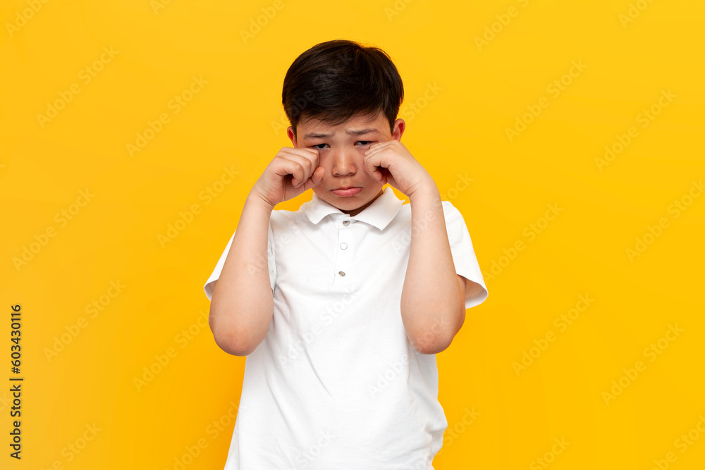 little asian boy is sad and crying on yellow background, offended korean child in bad mood and depression