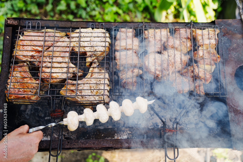 mushrooms and Meat steaks on a grill rack cooking over an open fire