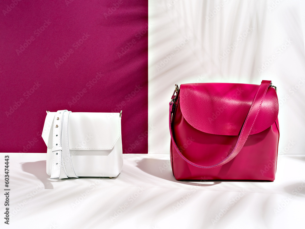 Fashion accessories sunlit still life. Capsule collection. Minimalist design, hue purple casual handbags with handle. Eco friendly technology and vegan materials. Fashion, shopping, sale concept.