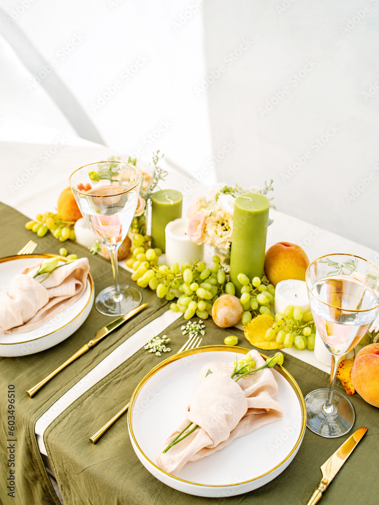 Festive colourful table setting. Restaurant, wedding, party decorated with flowers, candles, fruits and leaves. Midsummer or autumn mood event, romantic dinner. Florist decorator occupation.