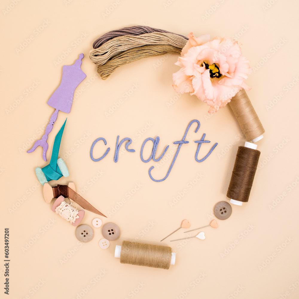 Tailoring and sewing accessories and assorted tools in a tender beige tones: pins, buttons, bobbins, lace, wooden model of mannequin. Concept of clothes design, hobby, handmade, crafts, DIY.