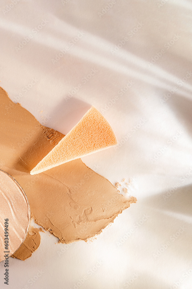 Still life of beauty products with soft light and shadows. Composition of smudged and scattered makeup texture. Closeup of nude makeup products for makeup artists promotion.