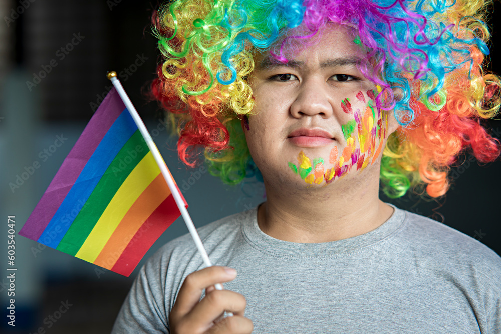 Portrait of gay teenager man at pride parade wearing colorful wig with LGBT flag standing on dark background.