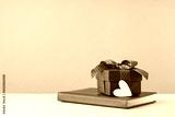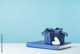Small luxury gift box with blue bow agenda and white heart. Side view. Fathers day or Valentines day gift for him. Corporate thank you concept or birthday party. Festive sale copy space banner