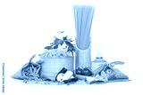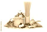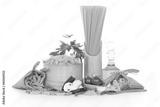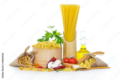 Variety of uncooked pasta and vegetables