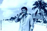 hispanic young man talking by mobile phone at the beach on vacations or holidays in Mexico Latin America, Caribbean and tropical destination