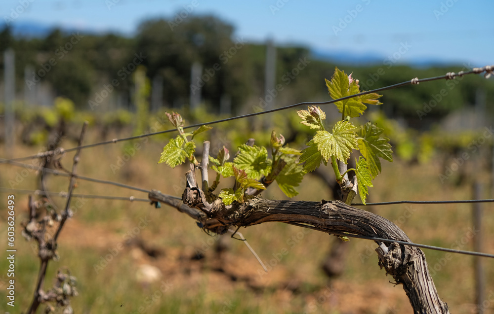 Grape leaves in springtime. Vineyards terroir of Porquerolles Island. France.