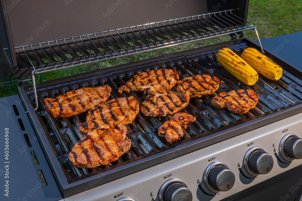 View of cooking meat steak with corn on cob on gas grill in courtyard of villa. Sweden.