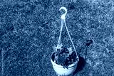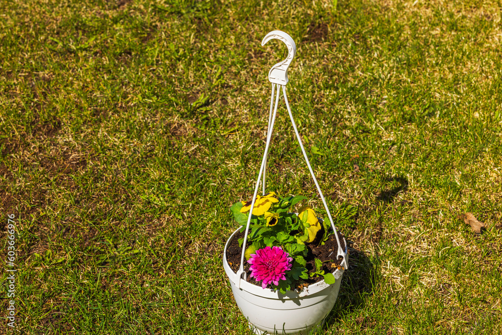 View of hanging basket with yellow-purple pansies and asters on grass background. Sweden.