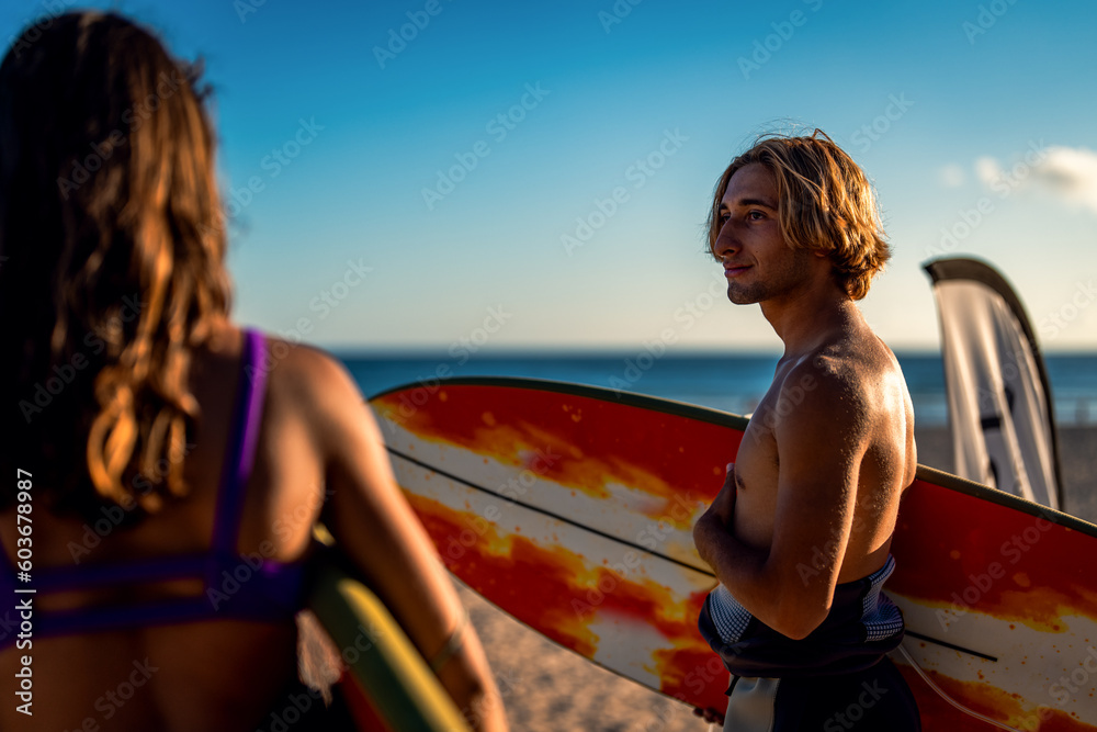 Two surfers with surfboard prepares to hit the waves at sunset.