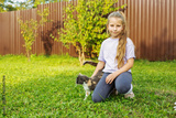 Little girl playing with cat in backyard. Sunny day. Childhood and pets concept