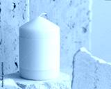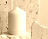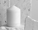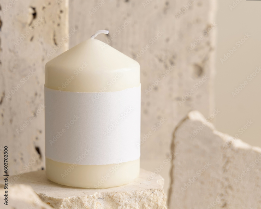 Candle with label on beige near cream travertine stones, Close up. Packaging mock up