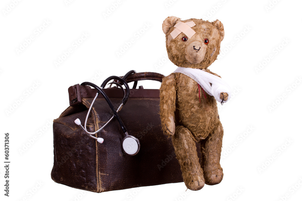 old sick teddybear on suitcase