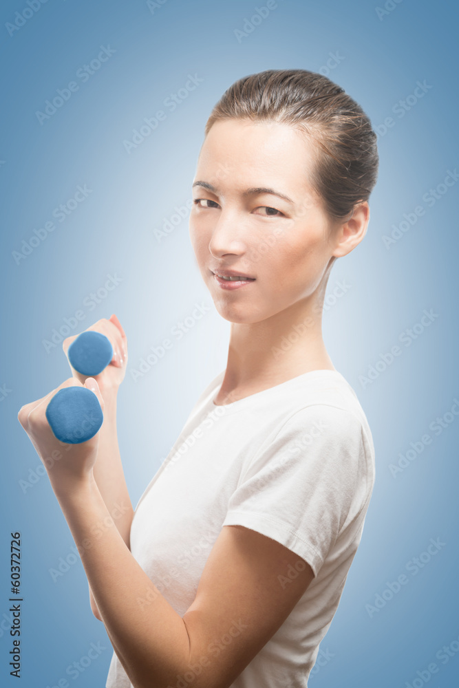 Woman is exercising with dumbbells