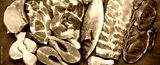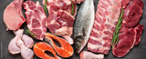 Raw fresh meat. Fresh beef, pork, fish, chicken and duck. Top view, flat lay, banner. Assortment of different meats.