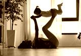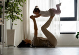 Cheerful mother and daughter playing at home. Mother laying on her back holding up her child in the air.