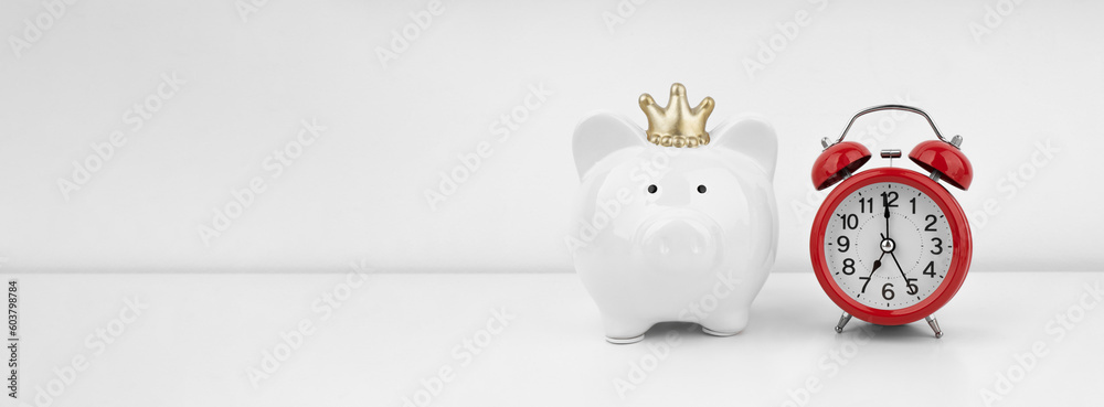 Red alarm clock with piggy bank against a white wall. Financial concept.