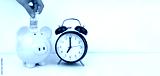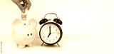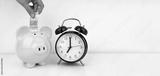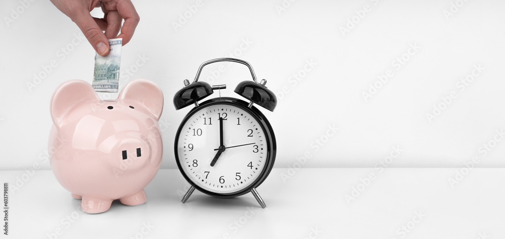 Womans hand put dollar bancnote into a piggy bank with alarm clock