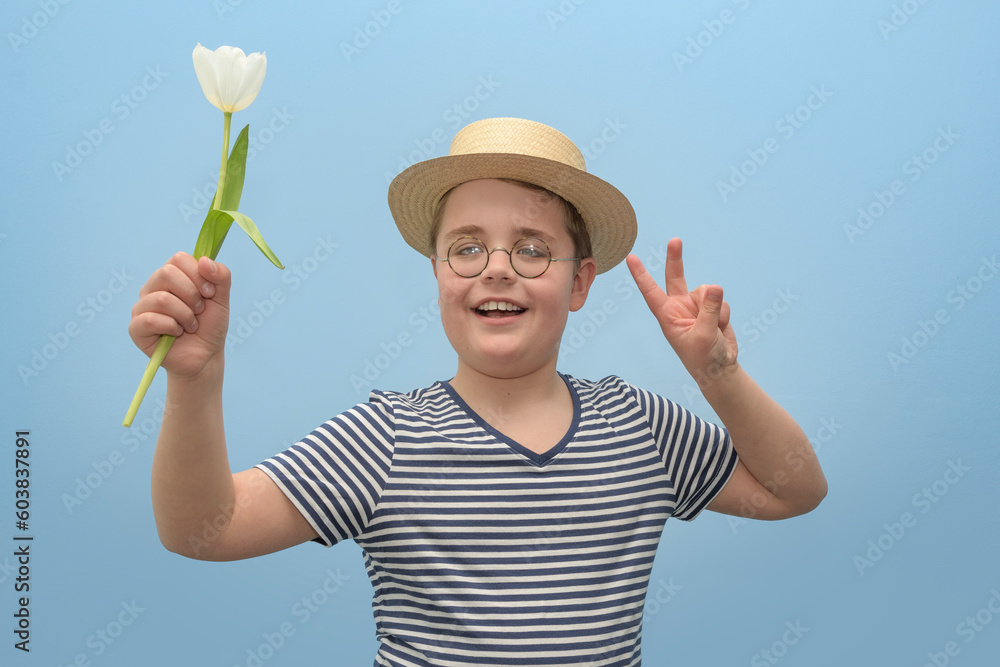 Smiling boy in a retro suit with a white tulip in his hand. Happy Valentine's Day