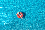 Aerial view of a woman in hat swimming with red swim ring in blue sea at sunrise in summer. Tropical landscape with girl, clear water, waves, sandy beach. Top view. Vacation. Sardinia island, Italy