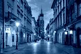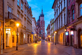 Night basilica of Saint Mary on Medieval Main market square in Old Town from Florianska street, Krakow, Poland