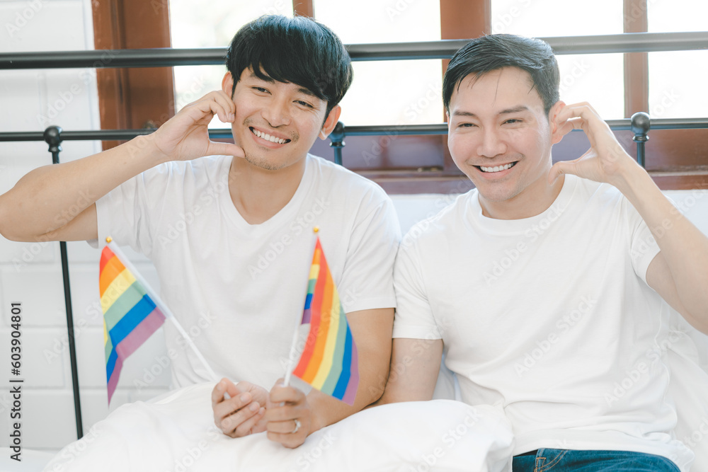Loving asian young gay men couple making a heart shape with hands and holding rainbow flag together. LGBT gay boyfriends. Selective focus.