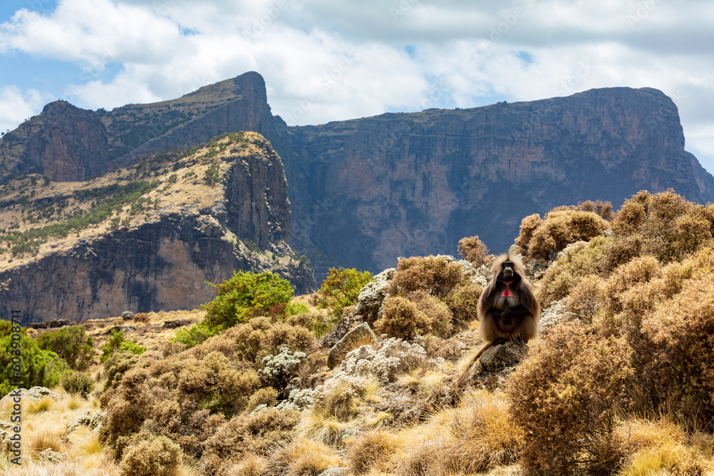 Family of Gelada (Theropithecus gelada), sometimes called the bleeding-heart monkey or the gelada baboon. Simien Mountains, Africa Ethiopia wildlife